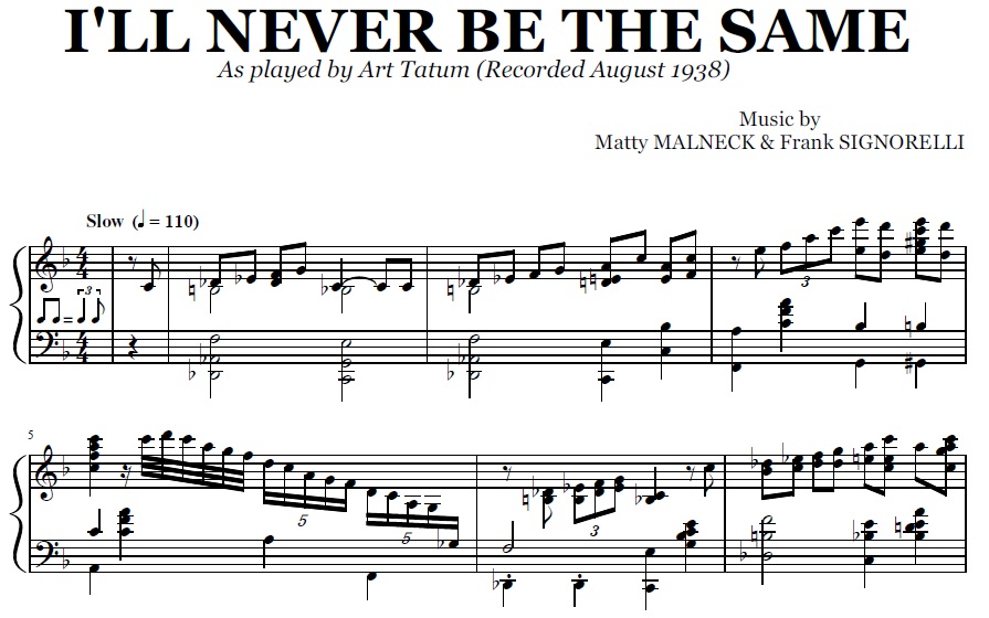 Buy the note for note transcription of I'll Never Be The Same by Art Tatum, from the original recording. You will be able to download the PDF sheet music as soon as the payment is complete.