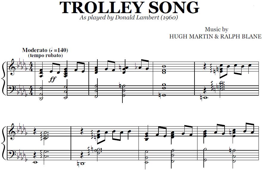 Buy the note for note transcription of Trolley Song by Donald Lambert, from the original recording. You will be able to download the PDF sheet music as soon as the payment is complete.