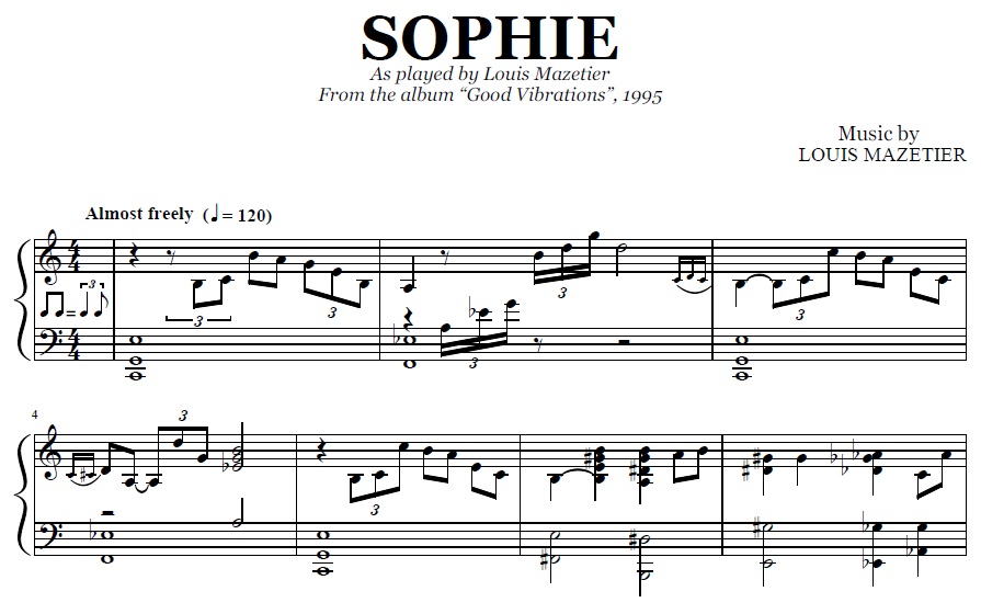 Buy the note for note transcription of Sophie by Louis Mazetier, from the original recording. You will be able to download the PDF sheet music as soon as the payment is complete.