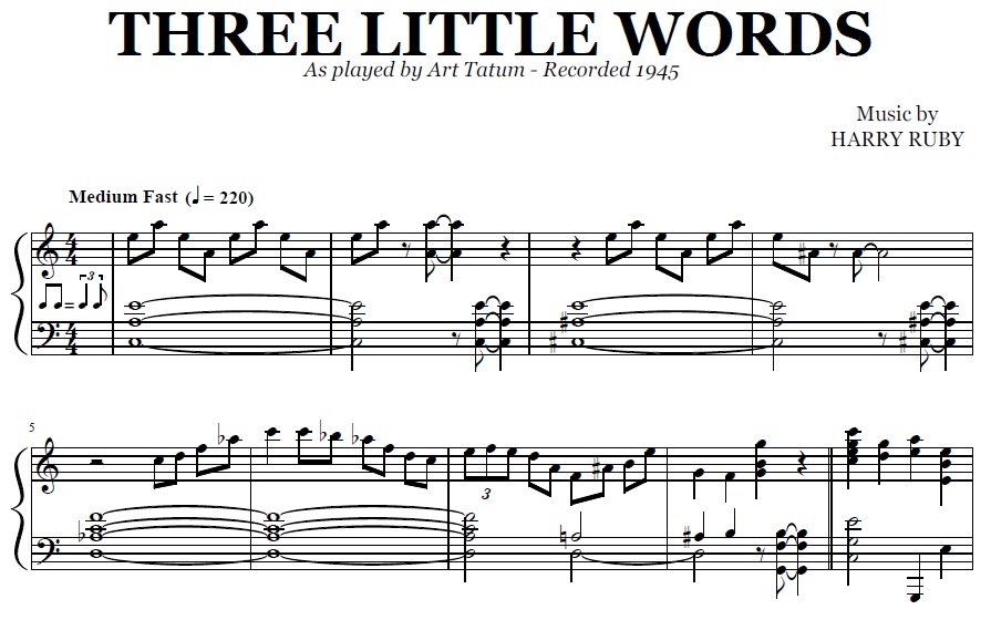 Buy the note for note transcription of Three Little Words by Art Tatum, from the original recording. You will be able to download the PDF sheet music as soon as the payment is complete.