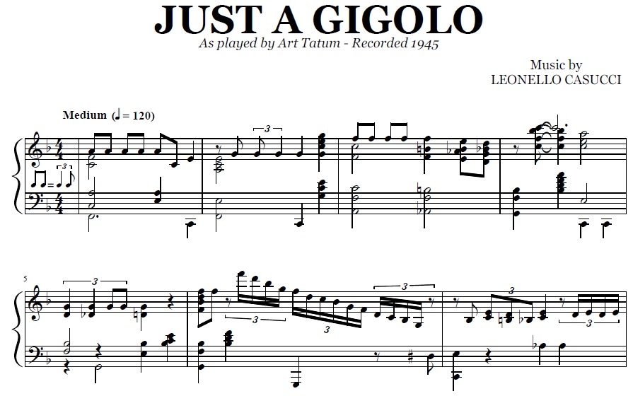 Buy the note for note transcription of Just A Gigolo by Art Tatum, from the original recording. You will be able to download the PDF sheet music as soon as the payment is complete.