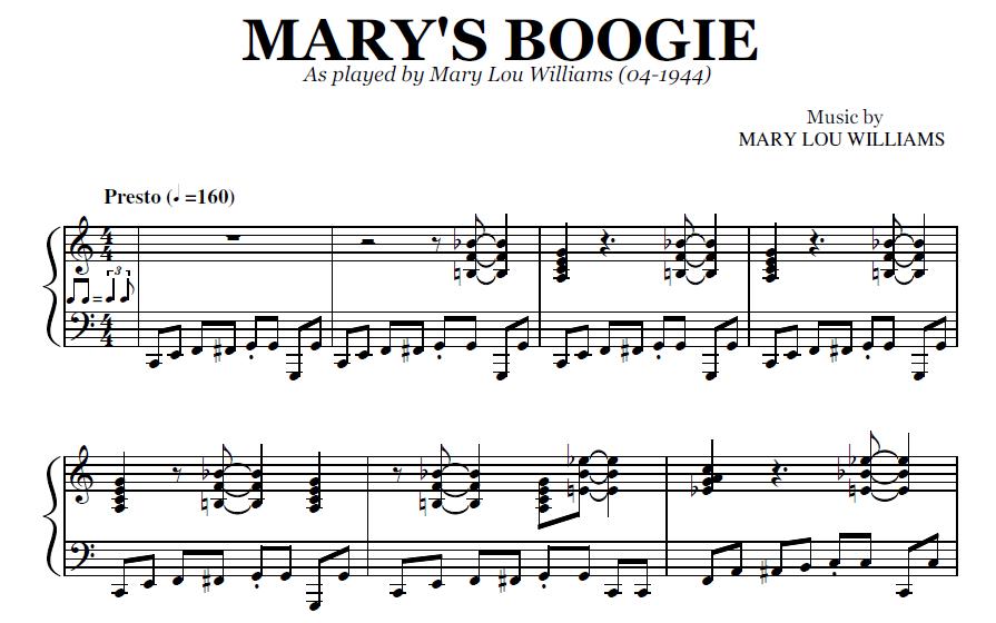Buy the note for note transcription of Mary's Boogie by Mary Lou Williams, from the original recording. You will be able to download the PDF sheet music as soon as the payment is complete.