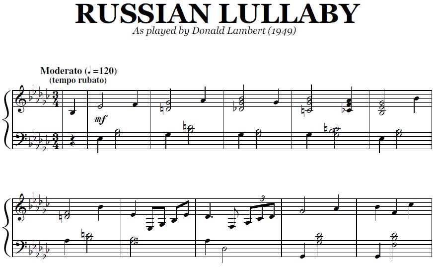 Acheter la partition en format PDF de Russian Lullaby (Donald Lambert), transcrite à partir de l'enregistrement original. Vous pourrez télécharger le PDF de la partition juste après le paiement.