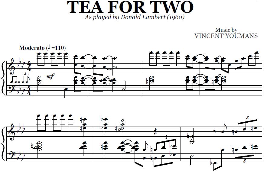 Acheter la partition en format PDF de Tea For Two (Donald Lambert), transcrite à partir de l'enregistrement original. Vous pourrez télécharger le PDF de la partition juste après le paiement.