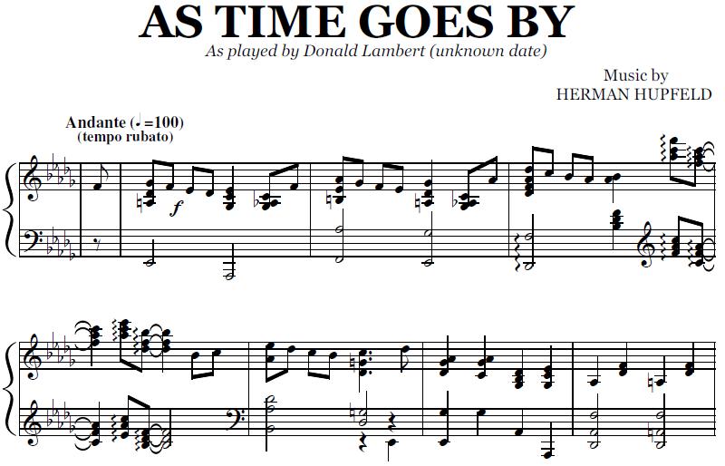 Acheter la partition en format PDF de As Time Goes By (Donald Lambert), transcrite à partir de l'enregistrement original. Vous pourrez télécharger le PDF de la partition juste après le paiement.