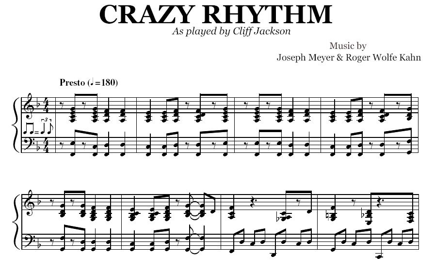 Acheter la partition en format PDF de Crazy Rhythm (Cliff Jackson), transcrite à partir de l'enregistrement original. Vous pourrez télécharger le PDF de la partition juste après le paiement.