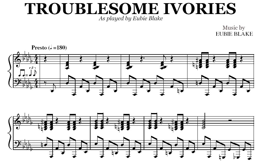 Acheter la partition en format PDF de Troublesome Ivories (A Ragtime Rag) (Eubie Blake), transcrite à partir de l'enregistrement original. Vous pourrez télécharger le PDF de la partition juste après le paiement.