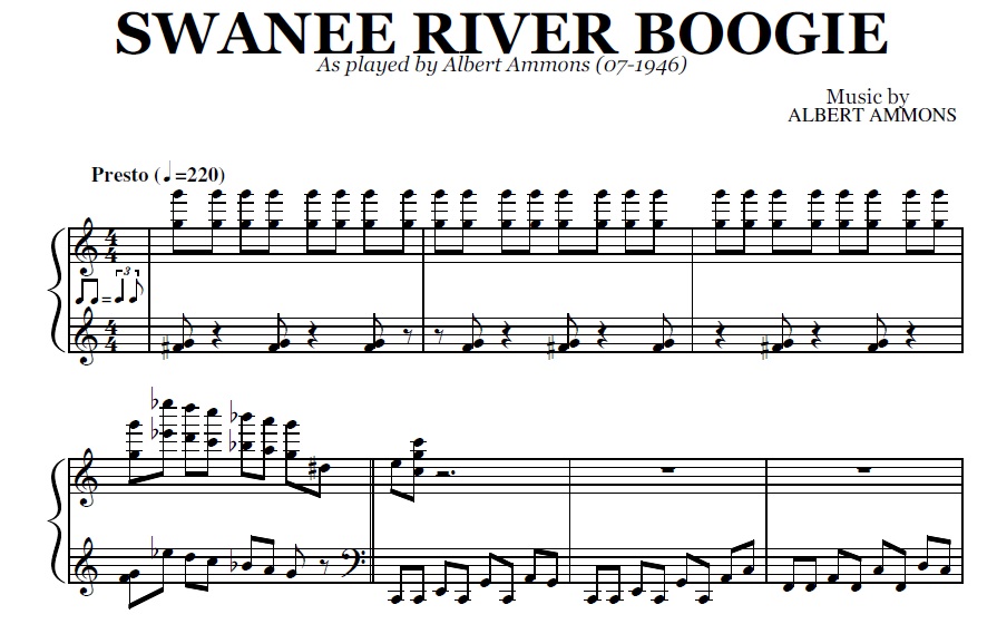 Acheter la partition en format PDF de Swanee River Boogie (Albert Ammons), transcrite à partir de l'enregistrement original. Vous pourrez télécharger le PDF de la partition juste après le paiement.