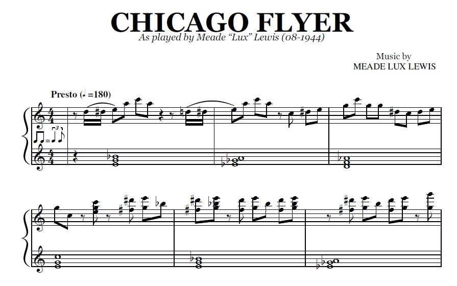 Acheter la partition en format PDF de Chicago Flyer (Meade Lux Lewis), transcrite à partir de l'enregistrement original. Vous pourrez télécharger le PDF de la partition juste après le paiement.