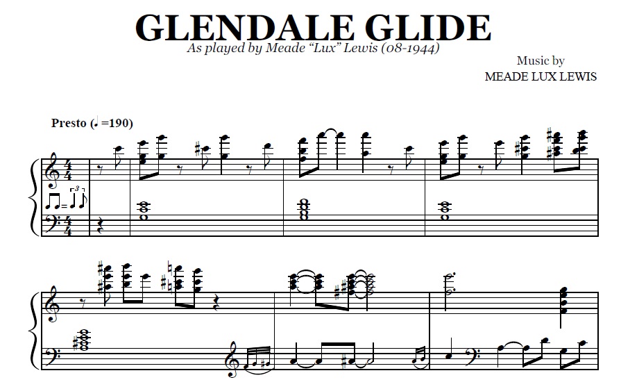Acheter la partition en format PDF de Glendale Glide (Meade Lux Lewis), transcrite à partir de l'enregistrement original. Vous pourrez télécharger le PDF de la partition juste après le paiement.