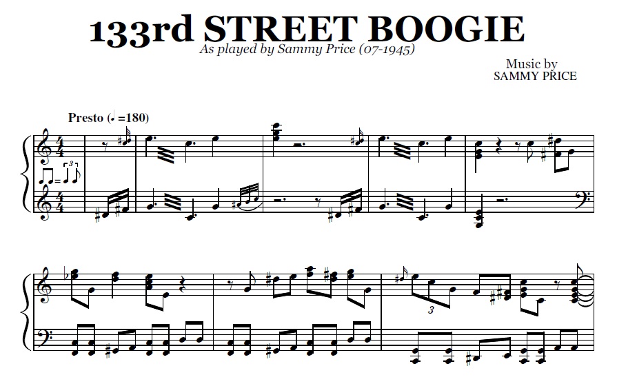 Acheter la partition en format PDF de 133rd Street Boogie (Sammy Price), transcrite à partir de l'enregistrement original. Vous pourrez télécharger le PDF de la partition juste après le paiement.