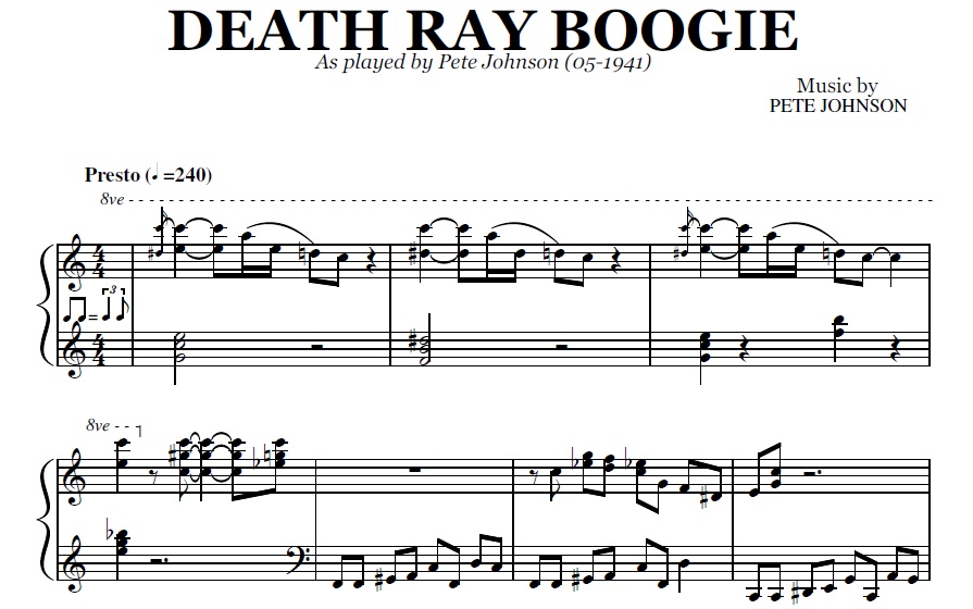 Acheter la partition en format PDF de Death Ray Boogie (Pete Johnson), transcrite à partir de l'enregistrement original. Vous pourrez télécharger le PDF de la partition juste après le paiement.