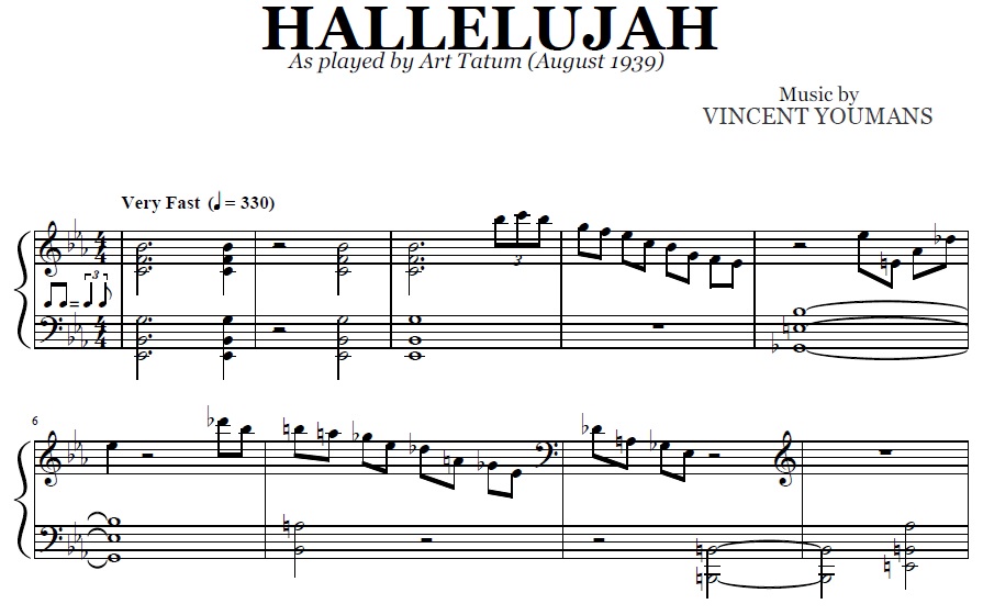 Acheter la partition en format PDF de Hallelujah (Art Tatum), transcrite à partir de l'enregistrement original. Vous pourrez télécharger le PDF de la partition juste après le paiement.
