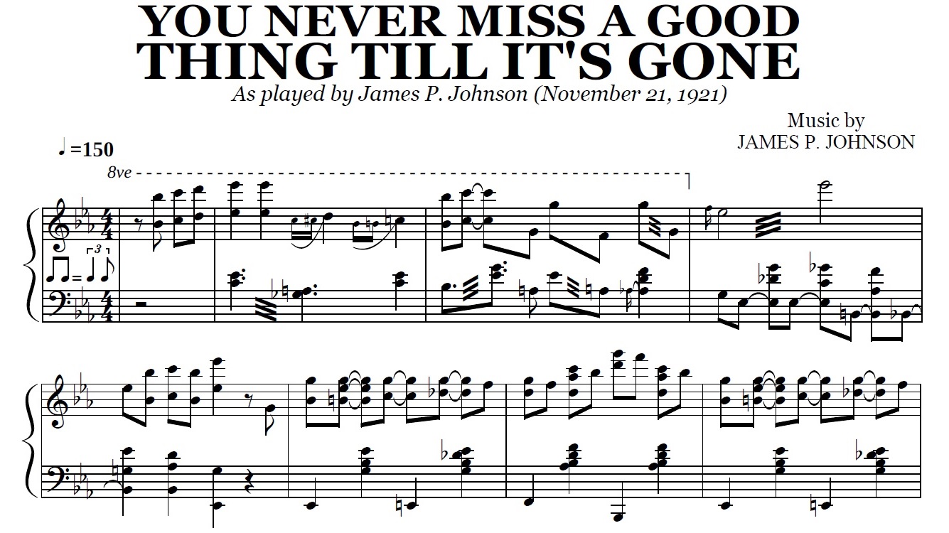 Acheter la partition en format PDF de You Never Miss A Good Thing Till It's Gone (James P. Johnson), transcrite à partir de l'enregistrement original. Vous pourrez télécharger le PDF de la partition juste après le paiement.