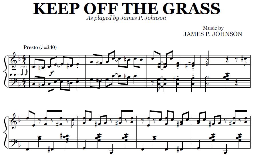 Acheter la partition en format PDF de Keep Off The Grass (James P. Johnson), transcrite à partir de l'enregistrement original. Vous pourrez télécharger le PDF de la partition juste après le paiement.