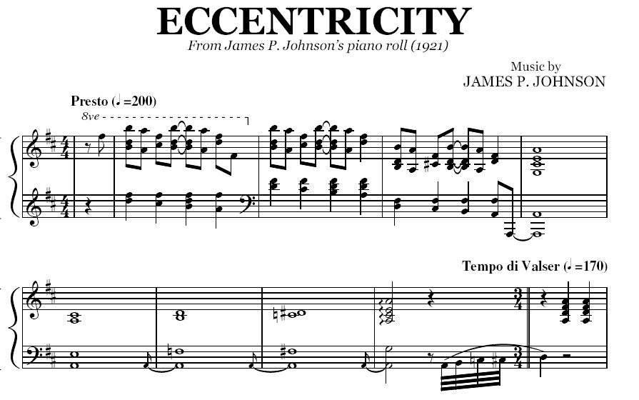Acheter la partition en format PDF de Eccentricity (James P. Johnson), transcrite à partir de l'enregistrement original. Vous pourrez télécharger le PDF de la partition juste après le paiement.