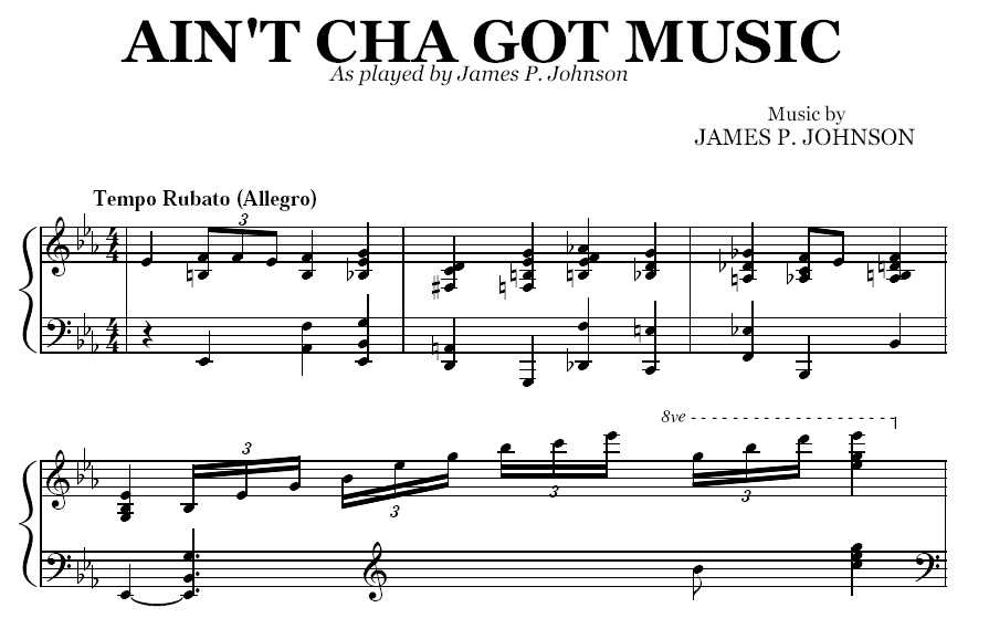Acheter la partition en format PDF de Ain't Cha Got Music (James P. Johnson), transcrite à partir de l'enregistrement original. Vous pourrez télécharger le PDF de la partition juste après le paiement.