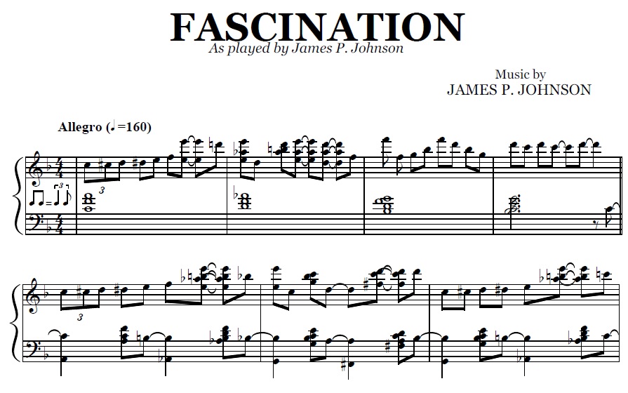 Acheter la partition en format PDF de Fascination (James P. Johnson), transcrite à partir de l'enregistrement original. Vous pourrez télécharger le PDF de la partition juste après le paiement.