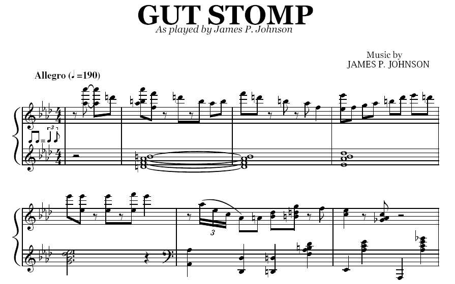 Acheter la partition en format PDF de Gut Stomp (James P. Johnson), transcrite à partir de l'enregistrement original. Vous pourrez télécharger le PDF de la partition juste après le paiement.
