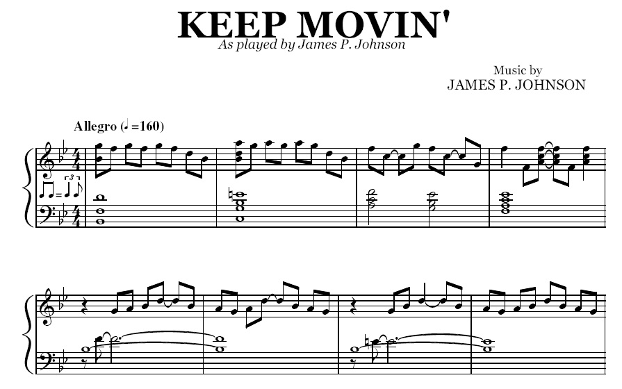 Acheter la partition en format PDF de Keep Movin' (James P. Johnson), transcrite à partir de l'enregistrement original. Vous pourrez télécharger le PDF de la partition juste après le paiement.