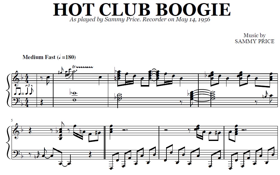 Buy the note for note transcription of Hot Club Boogie by Sammy Price, from the original recording. You will be able to download the PDF sheet music as soon as the payment is complete.