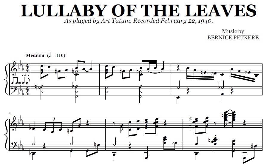 Acheter la partition en format PDF de Lullaby of the Leaves (Art Tatum), transcrite à partir de l'enregistrement original. Vous pourrez télécharger le PDF de la partition juste après le paiement.